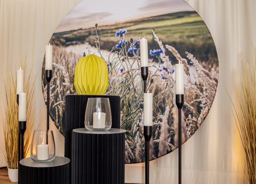 Ob in der Trauerhalle, im Abschiedsraum oder unter freiem Himmel – durch Farben, Materialien, Kerzen oder persönliche Gegenstände lässt sich eine Gestaltung umsetzen, die sowohl dem Anlass als auch den Wünschen der Angehörigen entspricht.